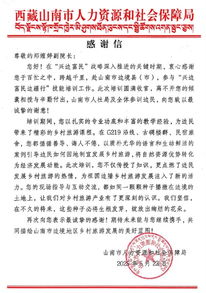 郑嬗婷副院长作为安徽省人社厅组织的文旅专家跨越千里,远赴西藏,参加了历时七天的“兴边富民边疆行”活动,克服高原反应深入乡镇一线,通过现场指导、专业授课等方式为边民传授乡村旅游经营管理知识,获山南市人社局致信感谢。党员教师张业臣、王汝幸带领支部教师和学生赴铜陵市义安区开展调研,承担该区旅游资源普查、“十五五”文化和旅游发展规划编制服务项目;并在义安区文化旅游局开展培训,指导当地旅游资源的开发与利用。