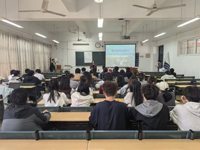 为进一步深化校企合作,提升酒店管理专业学生的职业认知与实践能力,3月25日,旅游与会展学院特邀三亚亚龙湾瑞吉酒店人力资源团队走进课堂,为酒店管理专业全体学生带来了一场别开生面的职业分享与交流活动。