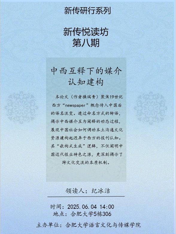 论文聚焦19世纪西方“newspaper”传入中国后的命名转译过程(“京报”→“新闻纸”→“新报”→“报”)。以译名变迁为视角,深入剖析中西媒介如何通过“互为阐释”建构起中国社会对该媒介的独特认知。研究揭示:每一次译名更迭都调动了本土沟通文化的相关范畴(如媒介分类、信息源标准、历史叙事),折射出认知逻辑的转变,并最终阐明“嵌构式生成”这一跨文化交流的核心机制旨在通过译名流变,理解中国近代报业实践特色形成的深层文化逻辑。