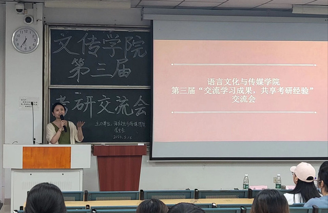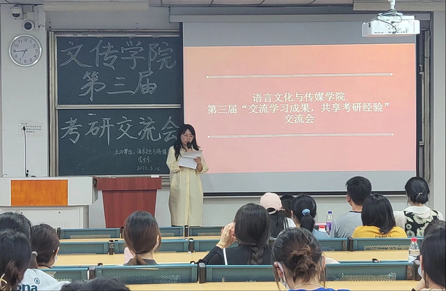 五月十六日晚六点半,语言文化与传媒学院第三届考研交流会在善思楼A座101教室顺利举办。本次活动由六名考研上岸的学长学姐分享自己的经验,为学弟学妹们提供参考和借鉴。语言文化与传媒学院学工办副主任顾盼盼老师、语言文化与传媒学院崔璨老师,语言文化与传媒学院学生会主席团成员作为嘉宾出席本次活动,文传学院各年级同学参与其中。