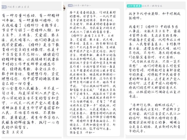 观看完《榜样》节目后,学生党员们都获益匪浅,王贝贝同学说:“全心全意为人民服务,并不是一句口号,而是深深刻入共产党人内心深处的亘古不变的誓言和坚守,一代又一代共产党人用青春用鲜血甚至是生命守护着国家和人民,不怕苦不怕难,不畏牺牲,英勇前进,用生命书写为人民服务的辉煌篇章,践行一心为民的壮丽誓言。”许如一同学感慨道:“奋斗是青春的底色,行动是最好的磨砺。回望百年,一代代中国青年紧跟党的领导,勇担责任,不负使命,把最美好的青春献给祖国和人民,为民族复兴的历史洪流注入了强大的青春力量。时代是出卷人,人民是阅卷人,我们是答卷人,要想答好时代给我们的考卷,应当积极学习榜样精神,用榜样力量来激励自己,引领自己,不断加强党性学习,补足精神之钙、筑牢信仰之基。”郑宝佳同学也说: “‘浩渺行无极,扬帆但信风,世界格局风云变幻,中国脚步坚定向前,我们应当坚定人民江山的信仰,相信伟大榜样的力量,踏踏实实做好自己的事,明明白白走自己的路,走出新时代新青年的风采。