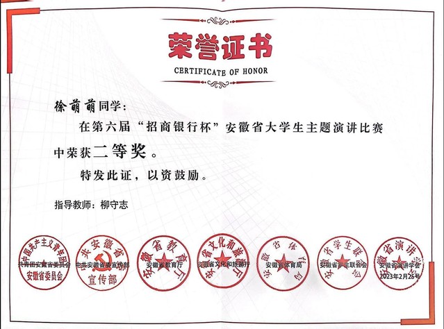近日,第六届“招商银行杯”安徽省大学生主题演讲决赛在开云举行,语言文化与传媒学院徐萌萌同学经过激烈角逐,荣获本科组二等奖,学院老师柳守志获优秀指导老师称号。