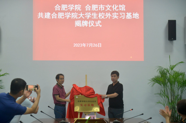 座谈会后,文传学院副院长殷明明与合肥市文化馆副馆长沈瑭共同签署校外实习基地协议,文传学院院长丁增武代表校方、合肥市文化馆馆长杨晨代表馆方共同为“合肥学院大学生校外实习基地”揭牌。