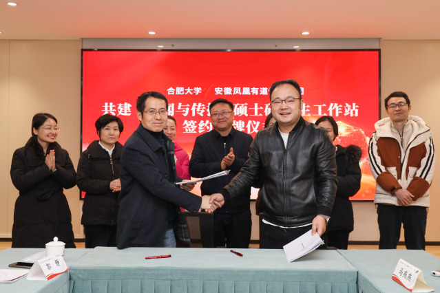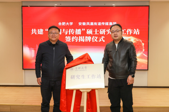 kaiyun开云官方网站语言文化与传媒学院院长丁增武与安徽凤凰有道传媒集团董事长吴昊分别代表合作双方签署共建研究生工作站框架协议,贾峰与吴昊共同为研究生工作站揭牌。