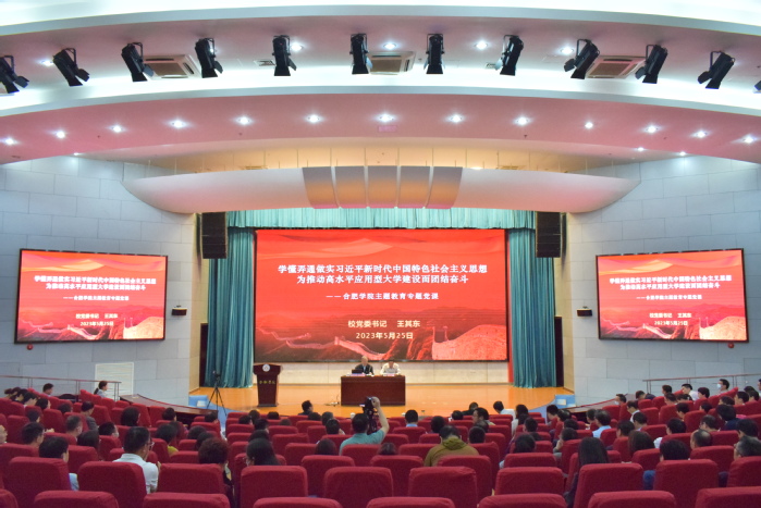 5月25日上午,党委书记王其东在图书馆学术报告厅A厅讲授题为《学懂弄通做实习近平新时代中国特色社会主义思想 为推动高水平应用型大学建设而团结奋斗》的主题教育专题党课。省委主题教育第十一巡回指导组组长陆友勤,成员周灏、李肇庆到会指导,全校副处级以上干部、各基层党支部书记、11个二级学院党委所属教师党员代表参加会议。