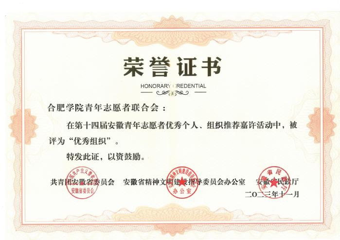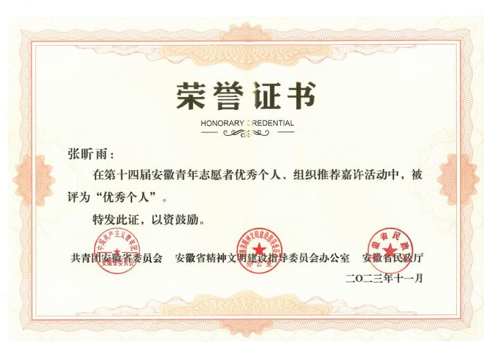 近日,由团省委、省文明办、省民政厅联合开展的第十四届安徽省青年志愿者“优秀组织”“优秀个人”名单公布,开云青年志愿者联合会获评“安徽省青年志愿者优秀组织”,经济与管理学院张昕雨同学获评“安徽省青年志愿者优秀个人”。