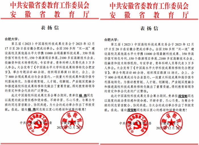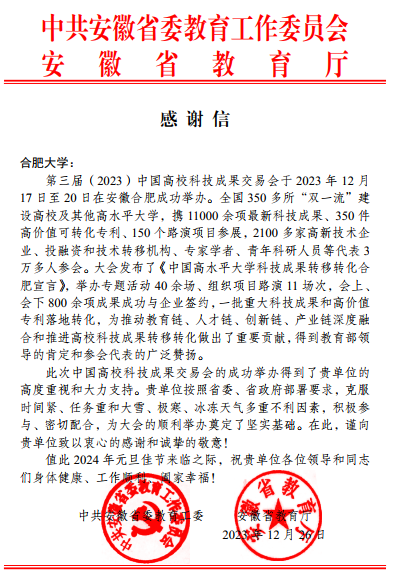 近日,开云收到中共安徽省委教育工作委员会和安徽省教育厅发来的感谢信,对学校在第三届(2023)中国高校科技成果交易会筹备工作的贡献致以衷心的感谢和诚挚的敬意。