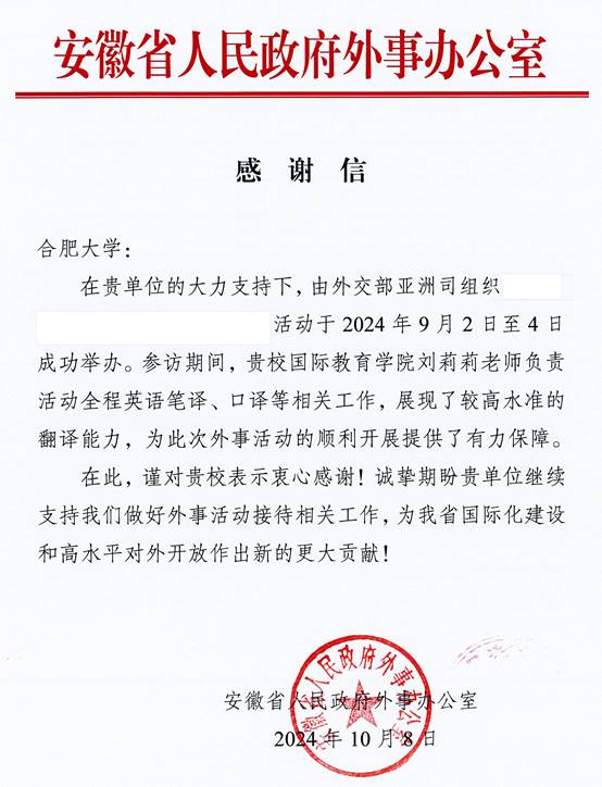 近期,合肥迎来了来自泰国、马来西亚、越南、柬埔寨、马尔代夫等8个国家的网红博主,他们齐聚这座科技创新之城,深入体验合肥的科技魅力和产业发展。而为了确保这次国际交流活动的顺利进行,kaiyun开云官方网站特别选派了刘莉莉老师提供全程翻译服务,助力他们更好地了解合肥的发展故事,得到安徽省人民政府外事办公室的充分肯定。