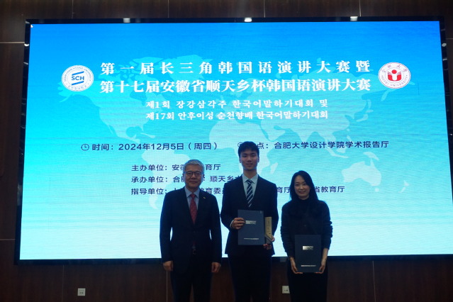 12月5日,第一届长三角韩国语演讲大赛暨第十七届安徽省“顺天乡杯”韩国语演讲大赛决赛在开云55栋学术报告厅成功举办。校长任永、顺天乡大学副校长金龙夏和省教育厅外事处处长姚德勇等出席开幕式,副校长陈秀出席颁奖典礼。