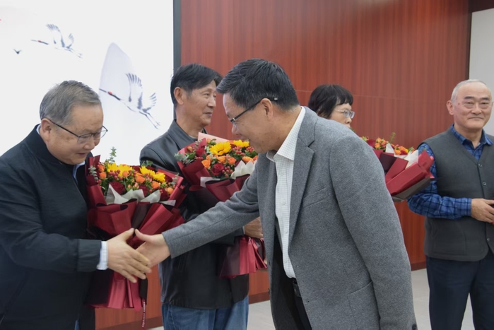 在集体祝寿环节,校领导为9位整寿老同志献上鲜花和贺卡,大家合影留念,现场气氛温馨热烈。