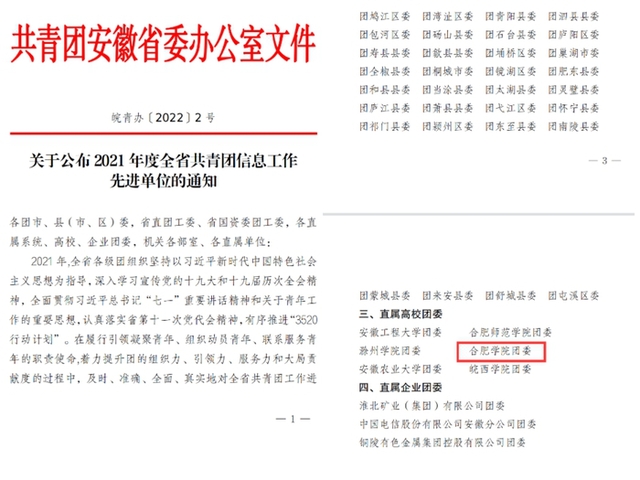 为树立典型、鼓励先进,进一步推动信息工作再上新台阶,共青团安徽省委在全省范围内评选出“2021年度全省共青团信息工作先进单位”70家,合肥学院团委获得该荣誉称号。
