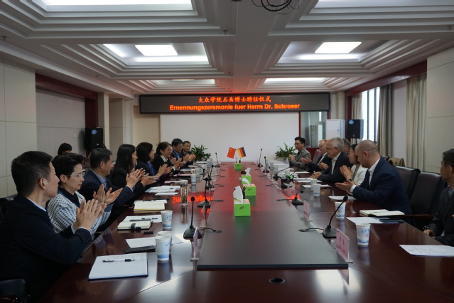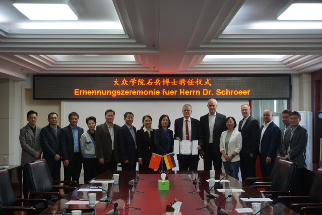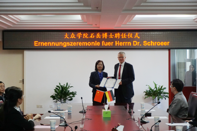 石岳博士感谢学校对他的信任,聘请其为特聘教授。他表示,非常高兴能再回到中国并利用自己的专业知识为学校与大众集团的合作做贡献。今后将作为纽带,推动大众集团与学校的深度合作,将丰富的实践经验和创新思维带到课堂,为学校全面提升人才培养质量添新亮点。