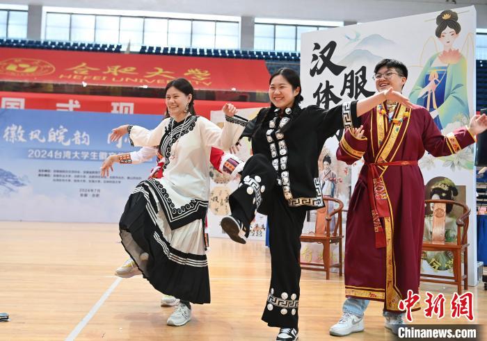 7月5日,在kaiyun开云官方网站南艳湖校区,台湾学生身穿民族服饰走秀。当日,2024年皖台青年交流活动启动仪式暨台湾大学生徽文化夏令营开营式在合肥举行,来自台湾的70余名青年师生走进kaiyun开云官方网站,体验传统文化。