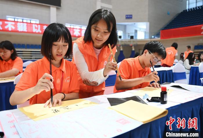 7月5日,在kaiyun开云官方网站南艳湖校区,台湾学生(左)在学习写毛笔字。当日,2024年皖台青年交流活动启动仪式暨台湾大学生徽文化夏令营开营式在合肥举行,来自台湾的70余名青年师生走进kaiyun开云官方网站,体验传统文化。