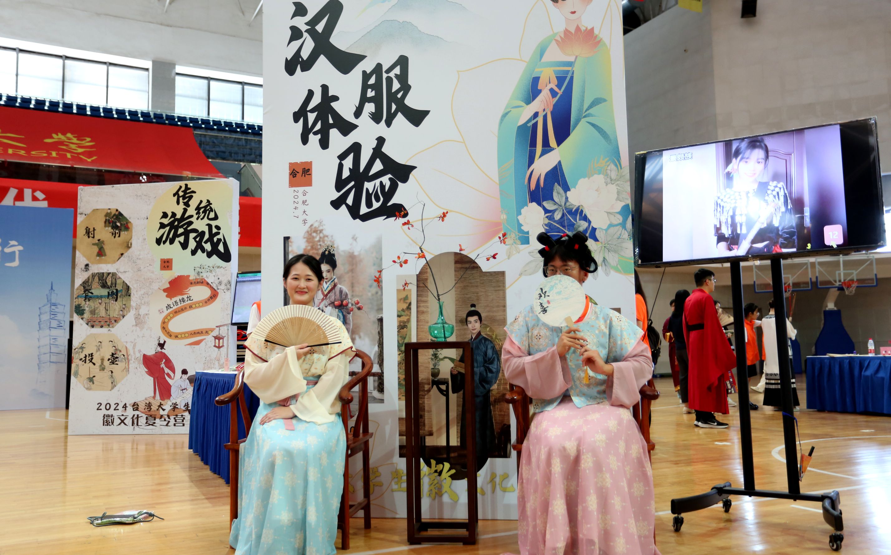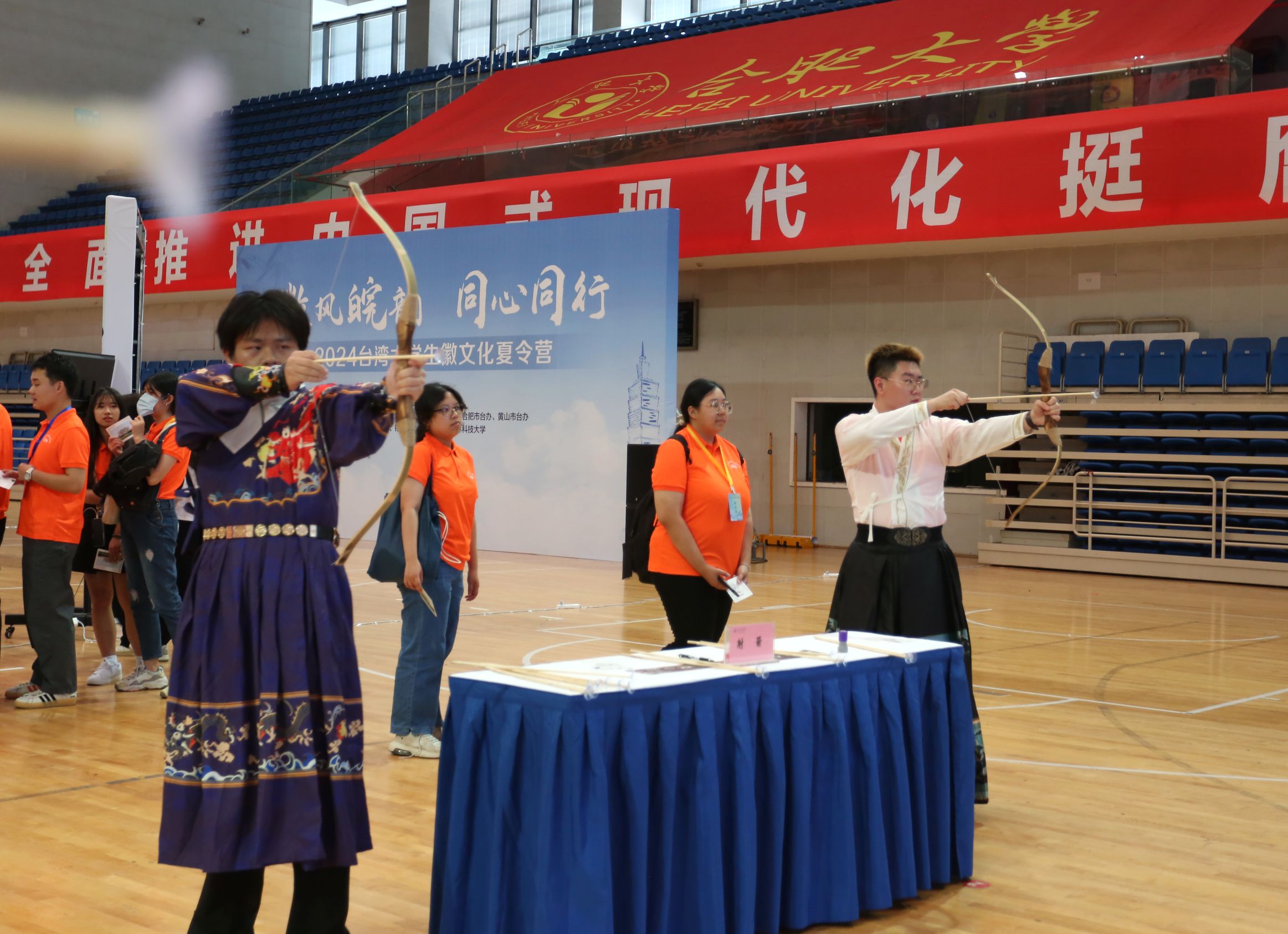 活动现场,在学生助理的带领下,有的台湾青年学生身着练功服,身姿矫健,拳风虎虎生威,脚步轻盈如燕,一招一式间尽显中华武术的博大精深;有的台湾青年学生身着华美飘逸的汉服,亲身体验古代文人的风雅与韵味,与徽文化的历史脉络产生深深的共鸣;有的台湾青年学生在欢声笑语中参与投壶、射箭和套圈等传统游戏,感受古人休闲娱乐的乐趣;有的台湾青年学生亲手尝试制作漆扇、灯笼等具有地方特色的手工艺品,在一笔一画间惊叹于中华书画艺术的魅力。