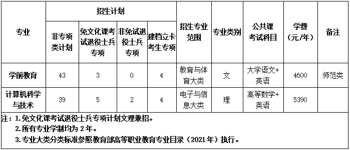 学前教育专业:在公共课达到省考试院划定的公共课考试合格分数线且两门专业课(学前教育学+学前心理学)总分必须达到110分(含110分)的基础上,根据考生考试科目的成绩总和从高分到低分排序,按非专项类招生计划数择优录取,如考生考试科目的成绩总和相同,则按单科顺序及分数从高到低排序,按非专项类招生计划数择优录取,单科排序为:学前心理学、学前教育学、大学语文、英语。
