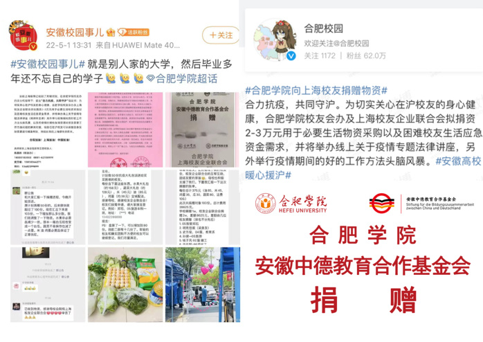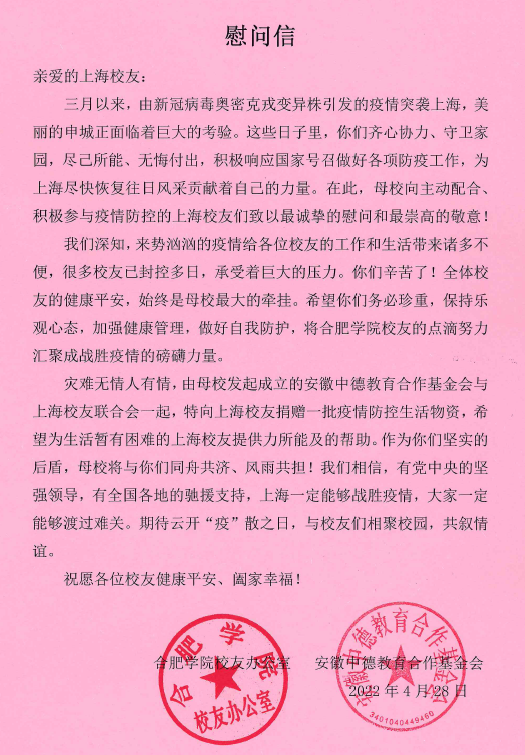 三月以来,由新冠病毒奥密克戎变异株引发的疫情突袭上海,疫情防控形势严峻复杂。合肥学院在守护好校园防疫安全的同时,也时刻心系在沪校友及其家人的健康平安。在学校党政的高度重视和关心指导下,4月28日,校友办和安徽中德教育合作基金会代表学校共同向上海校友发出了《慰问信》,鼓励大家坚定信心,凝心聚力,共抗疫情,表达母校对校友们的关怀与牵挂。