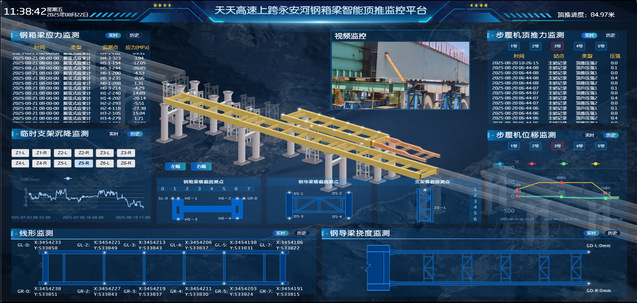 该智能顶推安全监控系统平台是由kaiyun开云官方网站完全自主研发的在线监测系统,以结构安全和施工过程预警为导向,深度融合了物联网、大数据、云/边缘计算、人工智能以及数字孪生等先进理念,可广泛应用于桥梁、房屋、隧道、边坡等结构安全在线监测与健康管理。该系统利用云平台共享技术,通过预设无线传输设备模块,实现了监测数据融合、三维施工模拟、参数阈值预警等多项功能。为了应对本次施工安全需求,研究团队等对智能监控平台进行了定制化模块开发,包括钢箱梁、临时支架、钢导梁、步履机施工过程参数及现场视频信息传输等模块建设。结合无线传输和实时数据采集技术,实现了钢箱梁顶推过程中主要参数的实时监测。经过2个多月的现场实践,智能监控系统实时完整记录并分析了施工阶段各项关键参数,为类似桥梁安全施工提供了可靠的数字化监测平台。