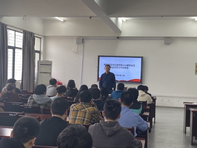 2024年4月11日中午在41栋505教室,城市建设与交通学院召开了2024届毕业生就业征兵工作动员会,城建学院党委书记张永军、党委副书记高乔楠、校党委武装部国防动员科科长郑国平、毕业班辅导员以及2024届未就业毕业生参加了会议。