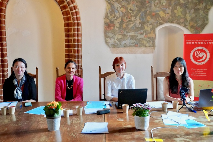 为筹办此次比赛,施特拉尔松德孔院半年前就做好了方案预设,成立了“汉语桥”筹备工作小组,在和汉诺威莱布尼茨孔院的合作过程中,双方每周定时召开一次线上会议,“汉语桥”工作小组成员们相互沟通,讨论大赛的筹备进程及遇到的问题等。在硬件设备上,施特拉尔松德孔院耗资购置了众多直播设备,并请专业技术人员反复进行设备的安装及调试,确保在比赛直播当天万无一失。在当地防疫规定允许的前提下,邀请了大赛的评委来到施特拉尔松德孔院,进行现场评分和沟通,确保比赛成果的公平公正公开。